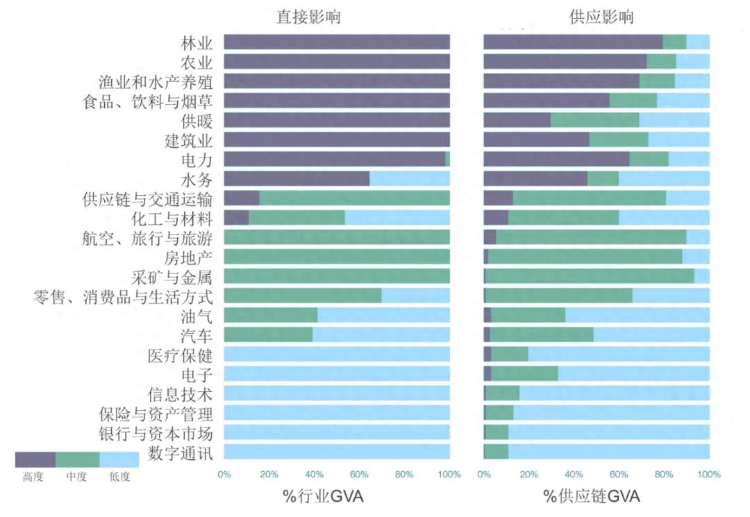 世界經(jīng)濟論壇研究顯示,盡管部分行業(yè)并沒有直接面臨自然損失風(fēng)險,例如化工與材料、航空、旅行與旅游、房地產(chǎn)、采礦與金屬、供應(yīng)鏈和交通運輸及零售、消費品與生活方式六個行業(yè)的總增加值(Gross Value Added, GVA)對自然的直接依賴度低于15%,但其供應(yīng)鏈環(huán)節(jié)中超過50%的GVA對自然存在中度或高度或依賴(如圖1)。
